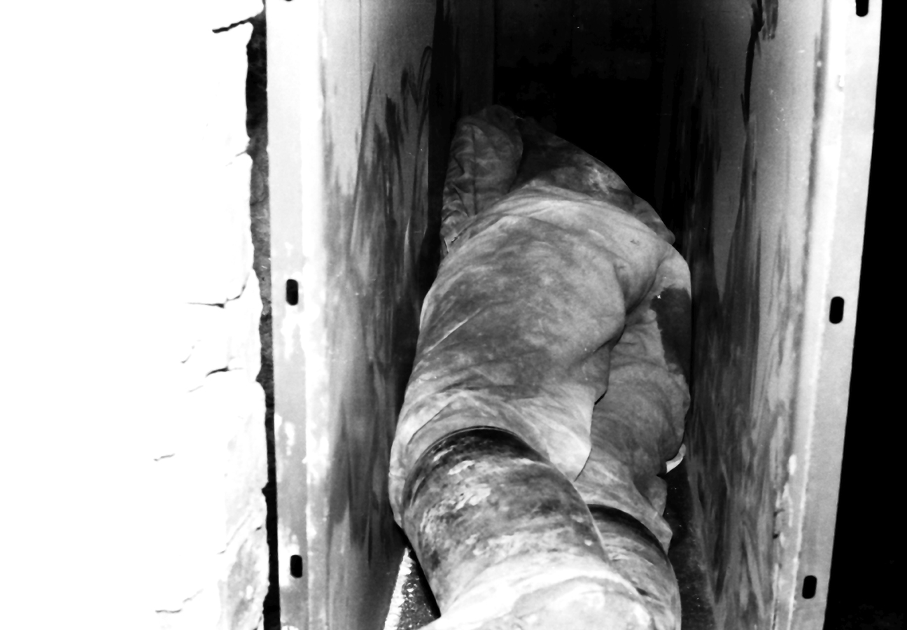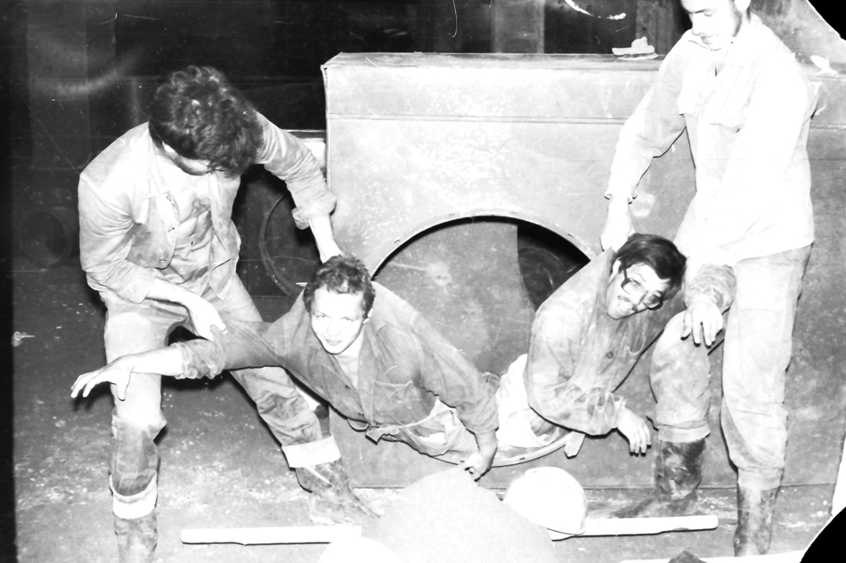 Сцена 8 - "Два бугая извлекают молоденьких строителей из трубы, ... а тут - и носилки гружёные бетоном подготовлены, и касочка лежит."